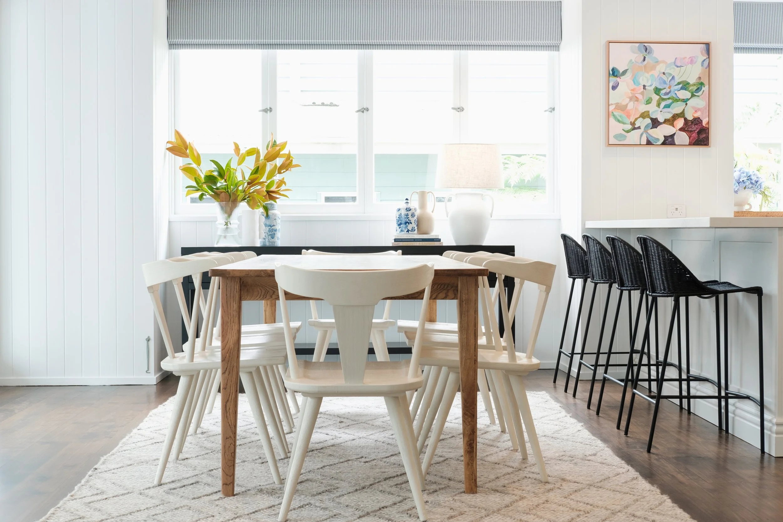 In this main dining room we found this heavy-weave rug with a diamond pattern. This added shape and texture at floor level while feeling soft under foot. This beauty is from Globe West and the quality is next to none. Sometimes using a rug that is simple, yet features a heavy weave can be just as effective in anchoring the space as a patterned rug. If every space has a pattern rug the home can start to feel busy. Breaking up the rooms with a variety of styles and finishes will help to create cohesion with tone and colour, while allowing other design elements to be focused on as well.